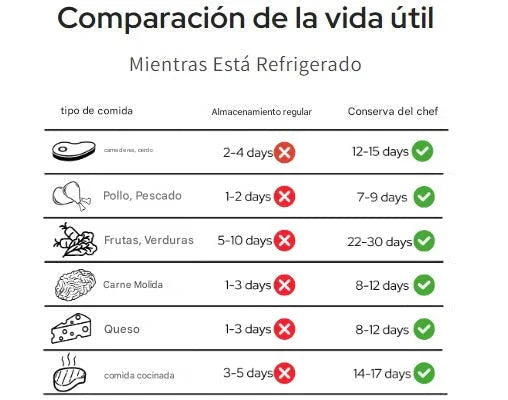Chef Preserve extenderá la vida útil de sus alimentos hasta 5 veces , ya sea que estén almacenados en el refrigerador, el congelador o la despensa.