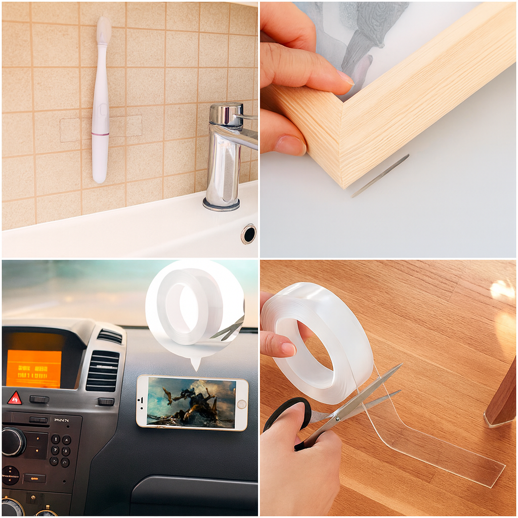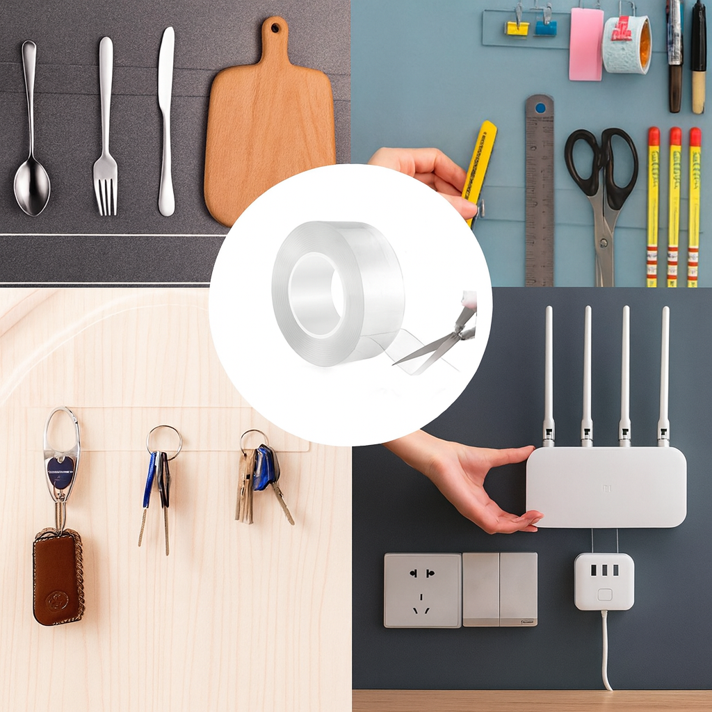Puedes colgar cuadros, organizar cables, fijar objetos sin perforaciones. Se adhiere a cualquier superficie como vidrio, madera, cerámica y más, sin dejar rastros.
