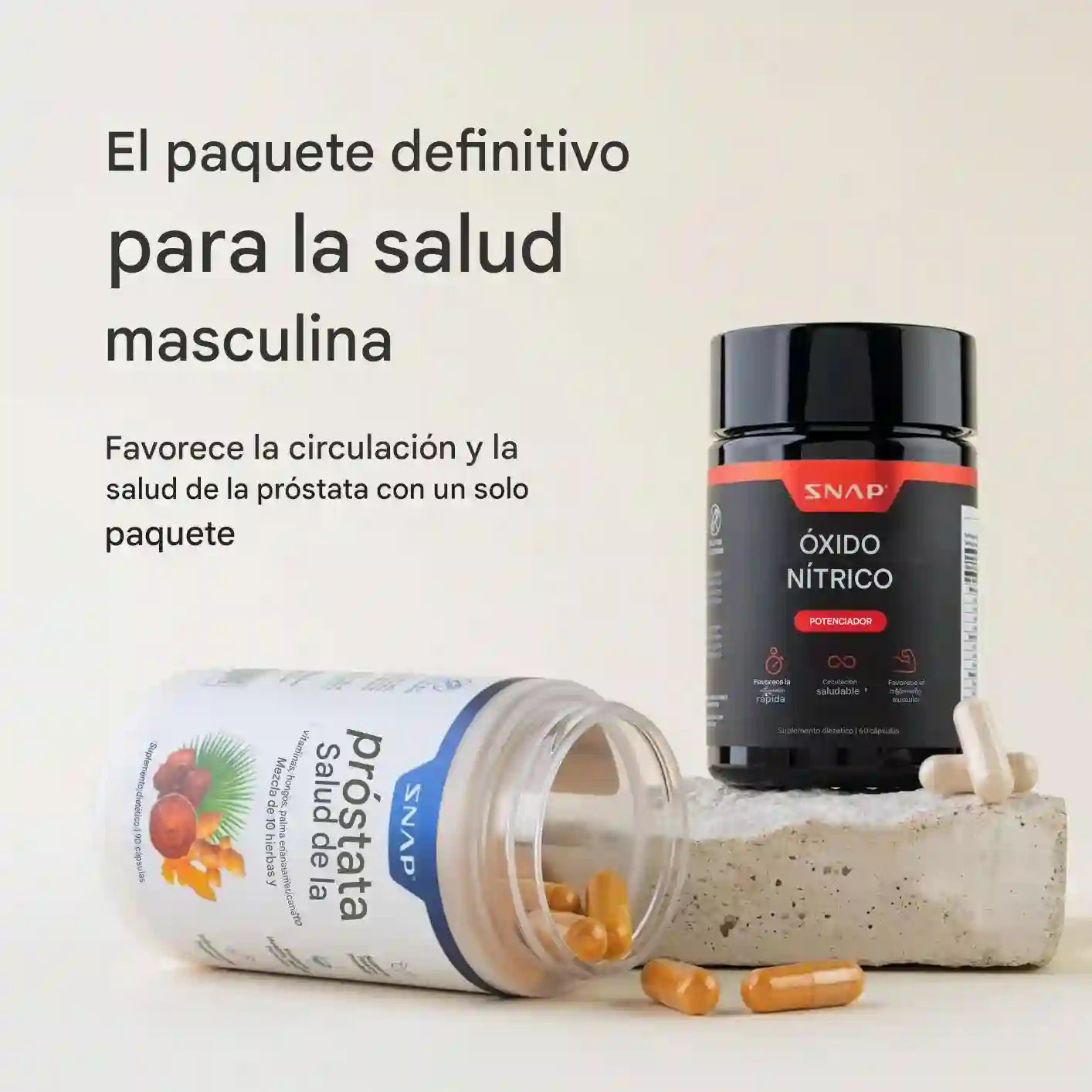 Doble fórmula diseñada para acompañar tu rutina masculina, apoyando la circulación y el bienestar urinario con ingredientes naturales.