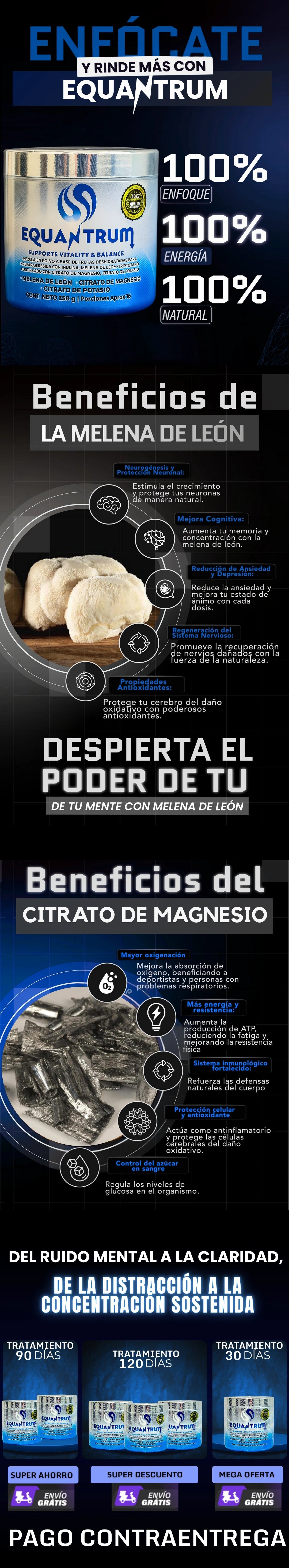 Puedes sentir mejoras en solo 7 días, como mayor enfoque, energía natural y bienestar digestivo. EQuantrum reemplaza tres suplementos distintos a menor costo, en formato fácil de tomar y de rápida absorción.